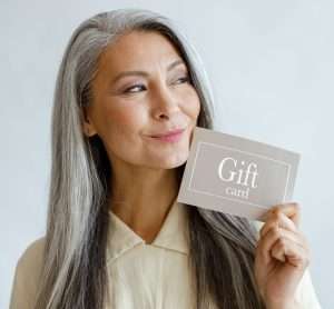 Positive silver haired Asian woman holds gift card standing on light grey background